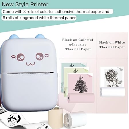 H S Mini Bluetooth Thermal Printer, Portable Label Printer Inkfree Printer for Android & iOS System, Black on White Thermal Printer with Roll of Print Paper, Stickers